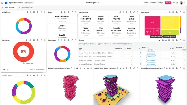 Create fast, live, shareable, and powerful analytics dashboards in Speckle without using Power BI—from element counts to carbon calculations.